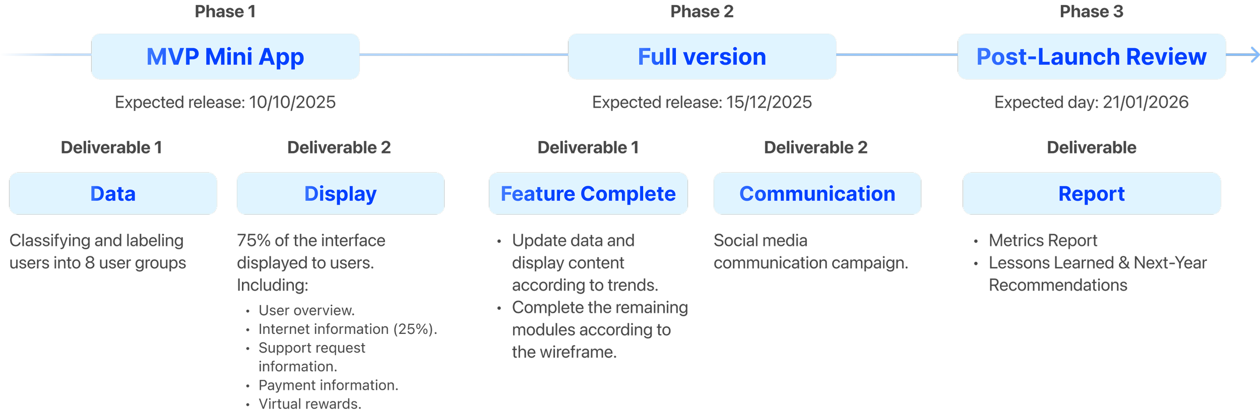 This phased approach ensures a focused MVP launch by October 2025, with full features and marketing push in December 2025